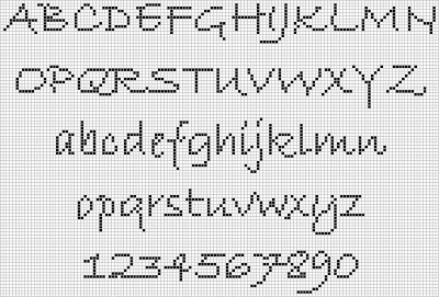 Free charts of alphabets and letters, using whole stitches that can be stitched in cross stitch, needlepoint, charted knitting, or beading.